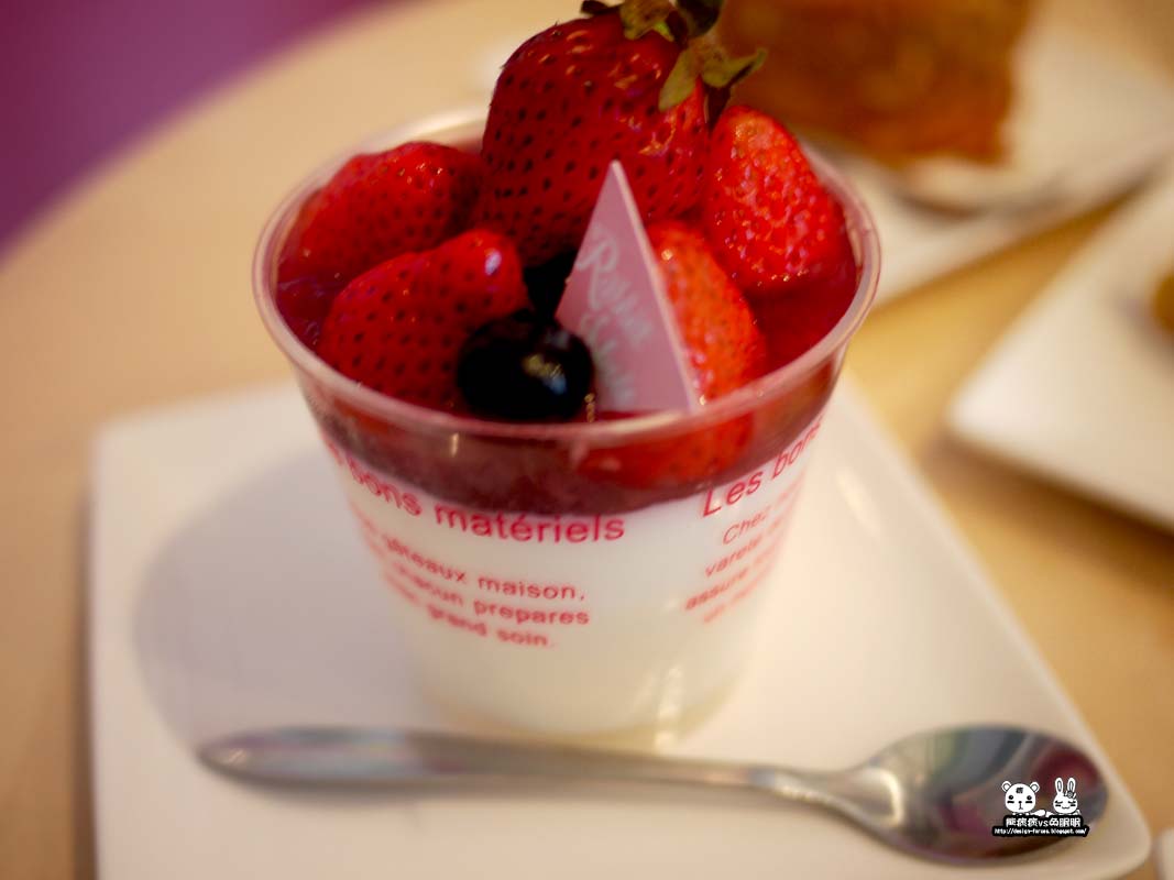 這是玫瑰草莓奶酪,最上層是新鮮的草莓,中間則是些許的草莓醬,聞起來有點淡淡的玫瑰香,下方則是濃郁的奶酪,軟綿濃稠的口感很棒,整體搭配起來超讚的。