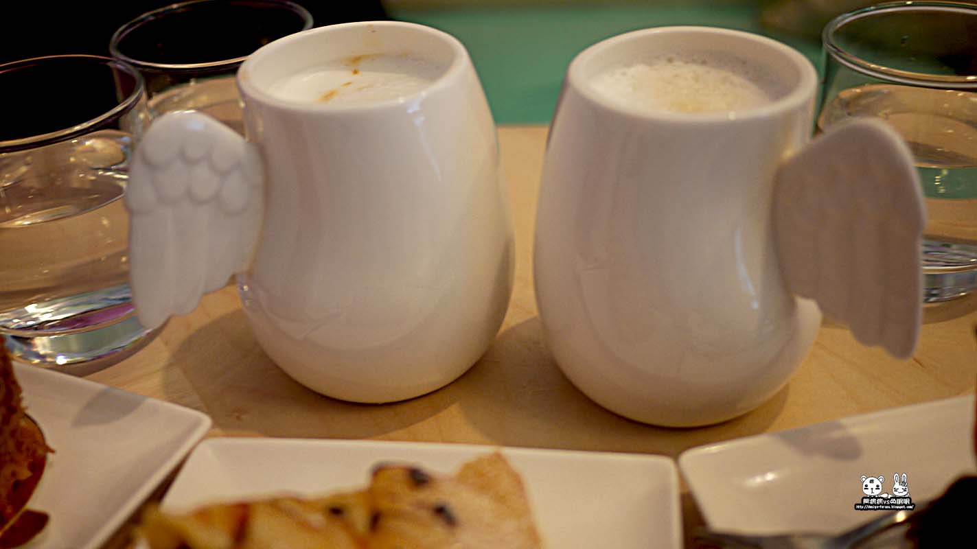這是我們點的咖啡,咖啡杯超可愛的,手把的部分是翅膀造形,兩杯放在一起,就像天使的羽翼,隨時都可以翱翔天際呢。