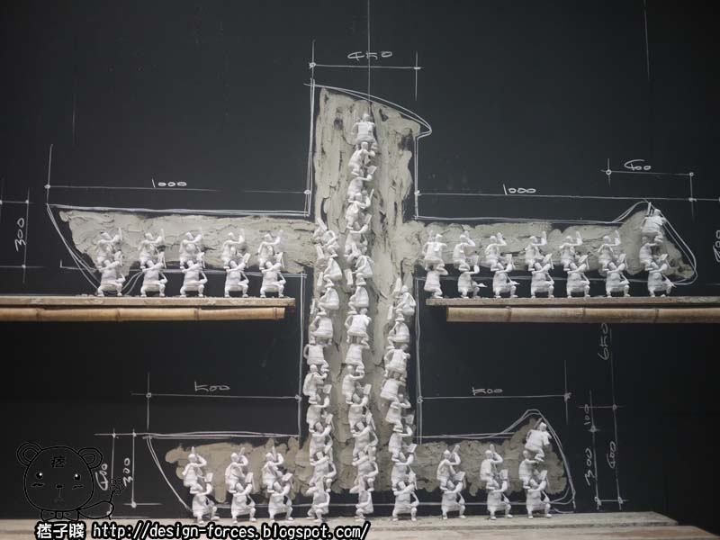 看到這張圖,配上這句話:「土」終於顛倒為「士」。不知大家有何感想?個人是覺得蠻震撼的,牆上大大的士,都是由勞工工人的小公仔組合而成的,在艱難的工程,也可以靠著勞工的努力,打出一片天。