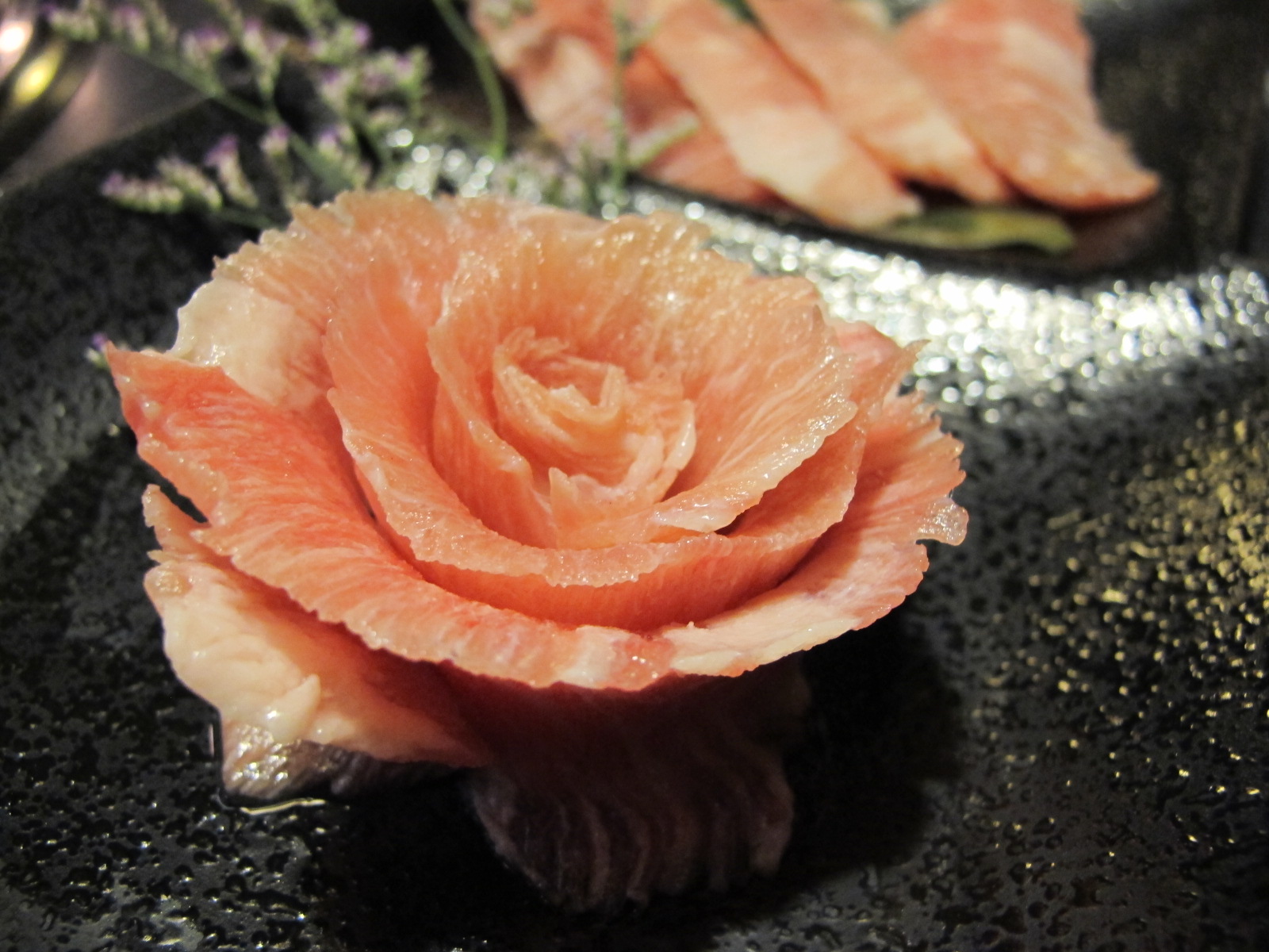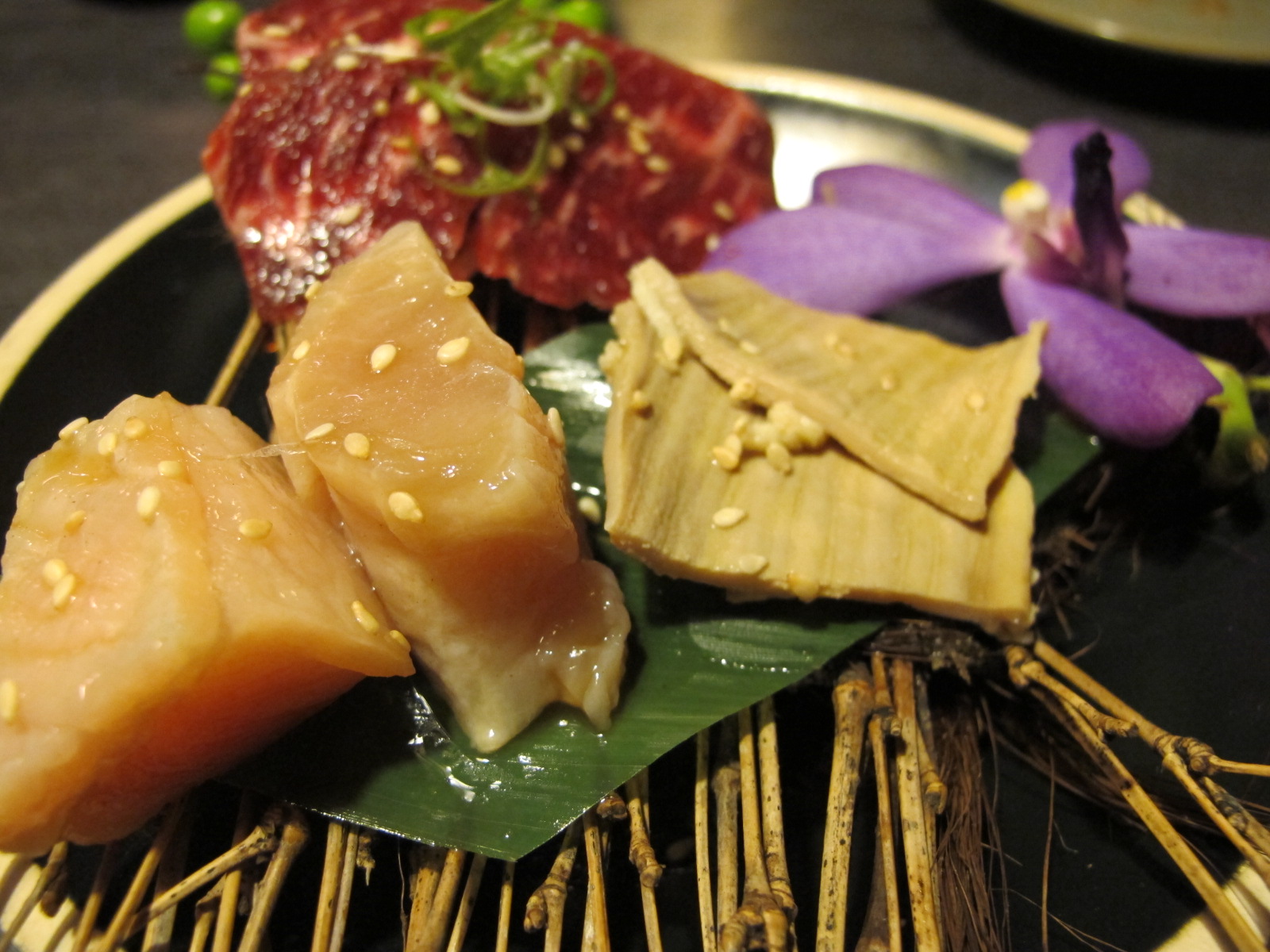 你看看、你看看,那樣漂亮的玫瑰花,誰吃得下去啊!好險烤的是店員,不然趴趴一定心痛得不想吃它,這是豬肉,玫瑰花是薄片,後面的拼盤是厚片,而且它絕不是只有外表好看而已,烤好之後擠一點檸檬,保證你喜歡上它!厚片外表烤的微焦,吃進去後更有口感、層次。