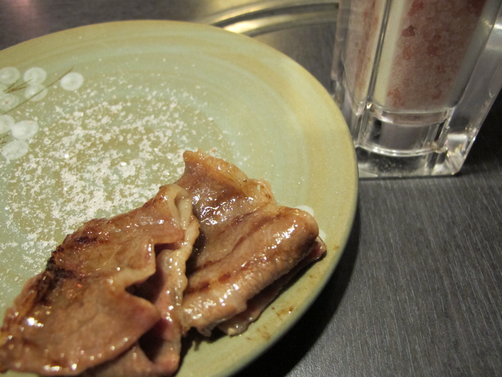 上圖就是烤好的肉片,旁邊的是玫瑰鹽,趴趴是沾鹽的愛好者,不是整片沾喔!沾一點點就好了,因為海鹽跟玫瑰鹽這種鹽鹹度高,沾在肉片上,當肉片送進嘴裡、沾到舌尖,舌尖會受到鹽的刺激,換個說法就是更能帶出肉片的原味!下次大家吃肉片的時候可以試著沾鹽看看。