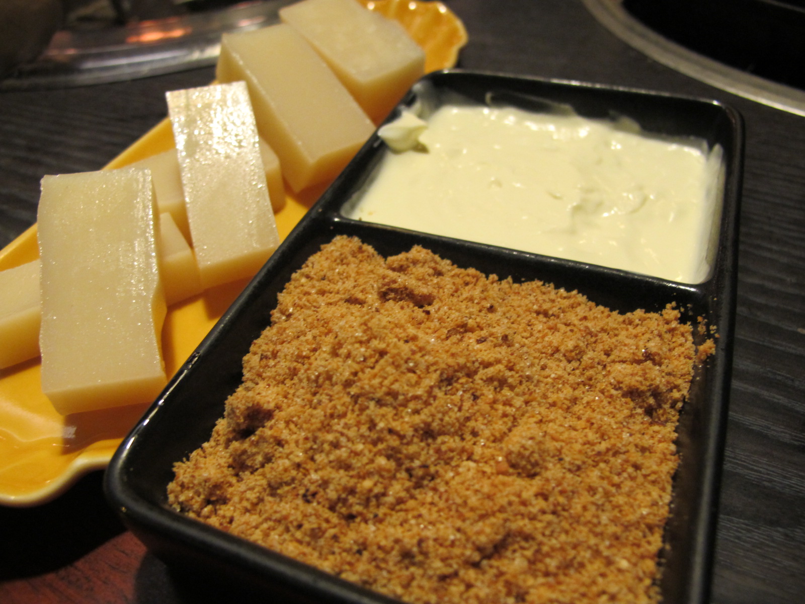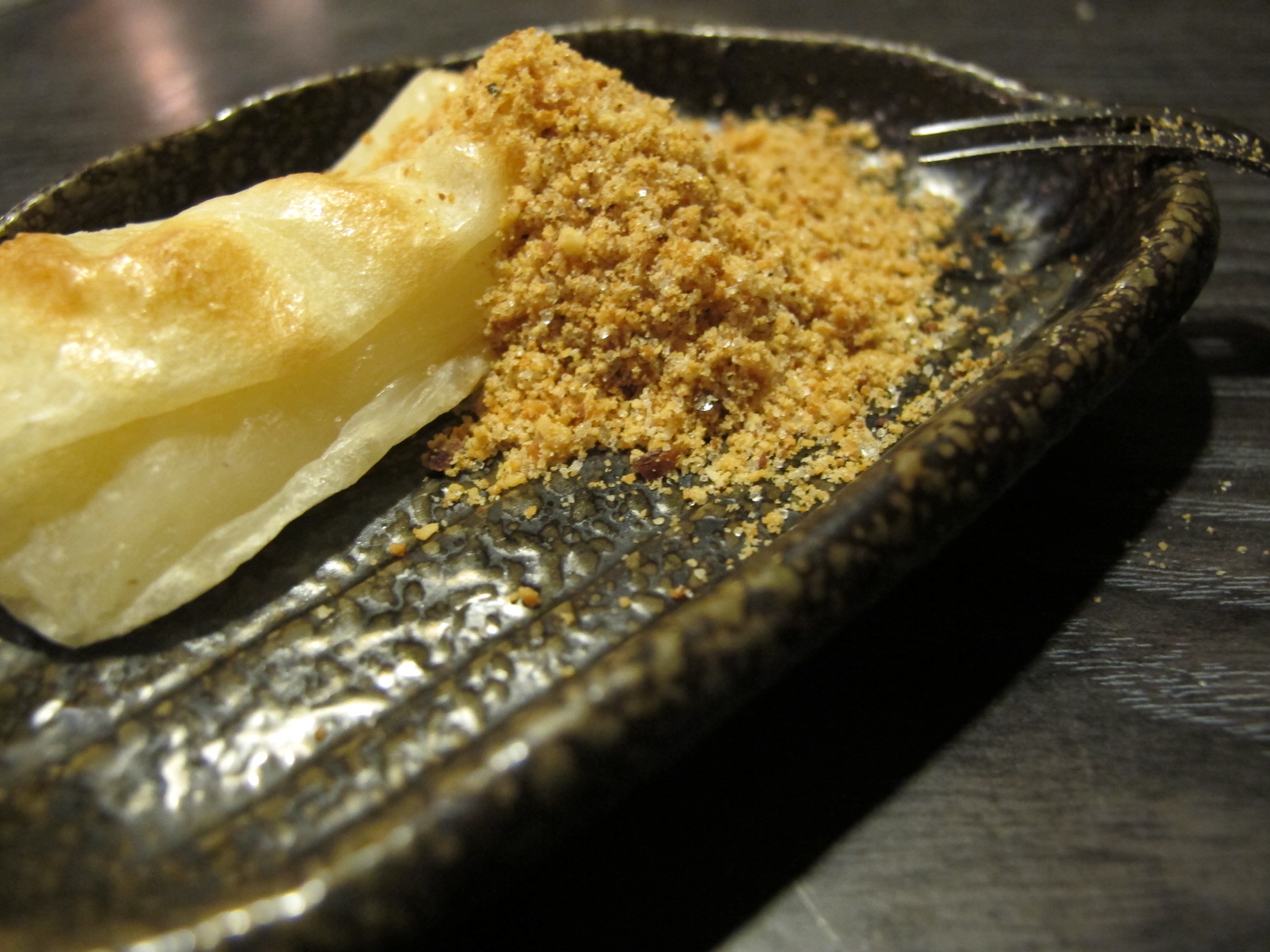 這甜點就特別了,剛送上來的時候,趴趴想著,難烤的麻糬又來了,後來店員熟練地幫我們烤,居然都沒有焦掉…你以為這是最厲害的?絕對不是!!!趴趴吃著沾了奶油跟花生粉的麻糬,聽到拍打聲,哇~店員說要用麻糬做餅乾給我們吃!一快快的麻糬黏成一片,店員耐心地拍打翻面,成型之後再烤到酥脆,真的很費工夫,就是第三張圖了!那就是餅乾麻糬,超級好吃,不沾花生粉更好吃,會吃到麻糬中米的香味,而且外層酥酥脆脆,這道一定要點!(記得請店員幫你烤)這是道神乎其技的料理!XD