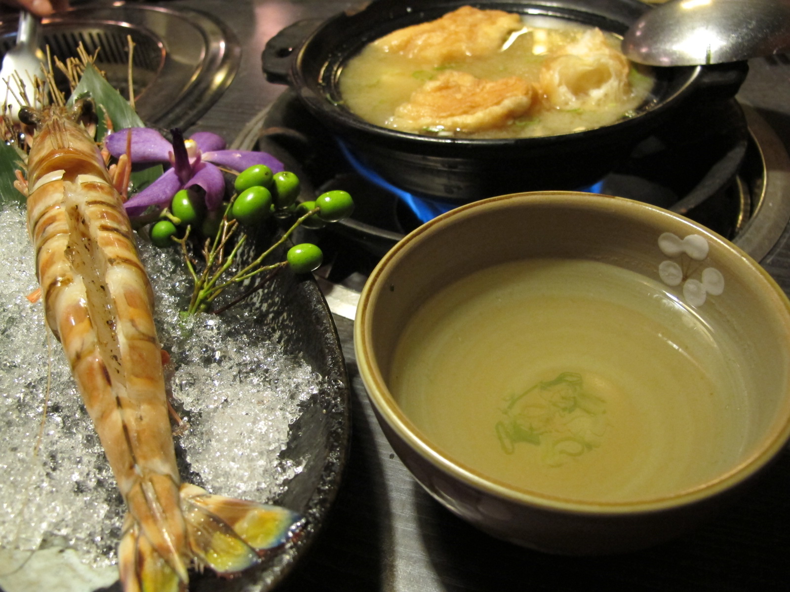 大蝦蝦出現了!!更重要的,還是不用剝殼!好愛>///<藍尾明蝦會搭配[味噌小鍋],烤完之後,把蝦頭丟進味噌小鍋裡煮,湯頭味道就會更鮮甜!吃大蝦蝦是很開心的一件事。