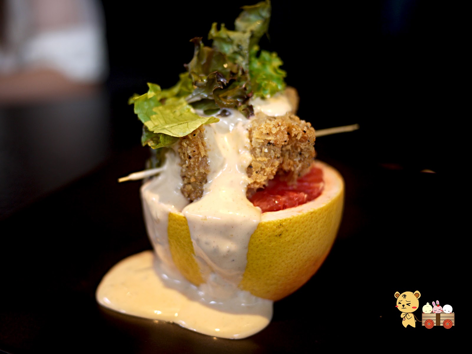 這是銀鱈葡萄柚,炸魚塊其實有點硬,但也沒什麼不好,有喀哩喀哩脆脆的口感,搭葡萄柚讓油膩感不見了,good。千島醬有膩到,大概是個人不愛,吃一兩口還可以,後面就不行了