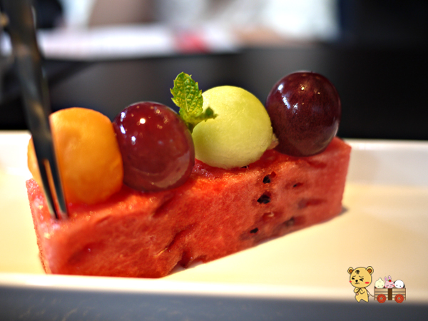 這是野菜蔬果沙拉,佐醬有百香果味,屬於甜系,但對兔而言太甜了;裝盤看起來不錯,兔說:但像我這種用筷笨拙的人,很怕夾了會掉菜(實際上也真的掉了)。