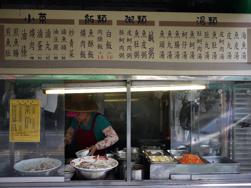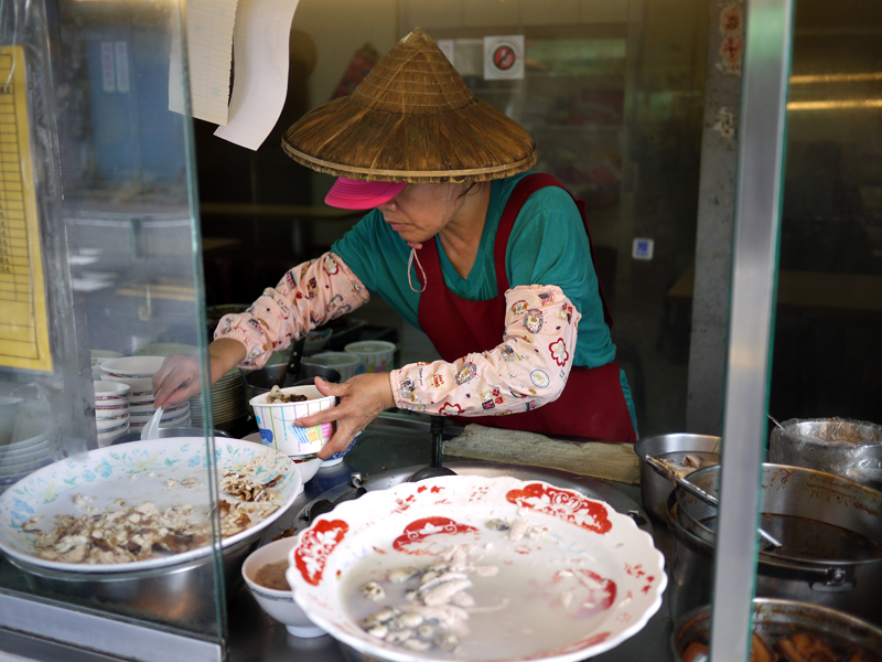 阿嬤戴著斗笠的樣子好帥喔,因為有客人要外帶,所以阿嬤正在準備他們的餐飲,看起來很辛苦,現在不都應該是要享福的年紀嗎?
