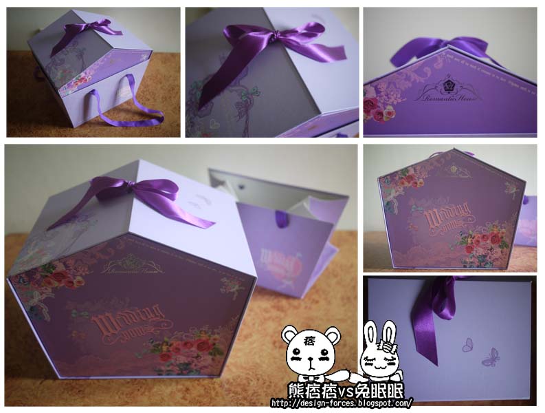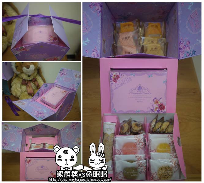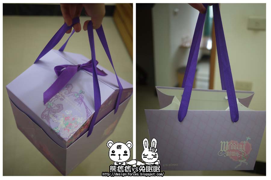 紫色系風格的包裝,印有許多精緻的圖案,深受熊熊的喜愛,尤其是房屋形狀的包裝設計,配上紫色蝴蝶結,讓人有種家的感覺!而且,即使吃完喜餅,包裝還可以當做收納盒收藏呢,十分好用。