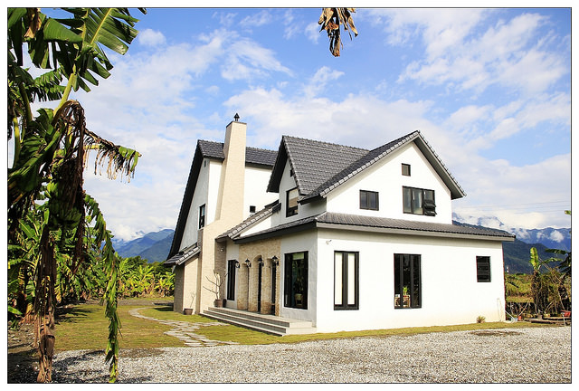 從民宿庭園往前看就是一望無際的田野景觀,清晨遠方山巒有薄霧圍繞~清新的空氣伴隨著綠草芳香,住在這裡真的好幸福喔!!矗立於田野間的♥拾晴莊園♡有著相當歐風的建築外觀~白米相間的外牆搭配灰色仿瓦片屋頂讓人有置身歐洲小鎮的錯覺。