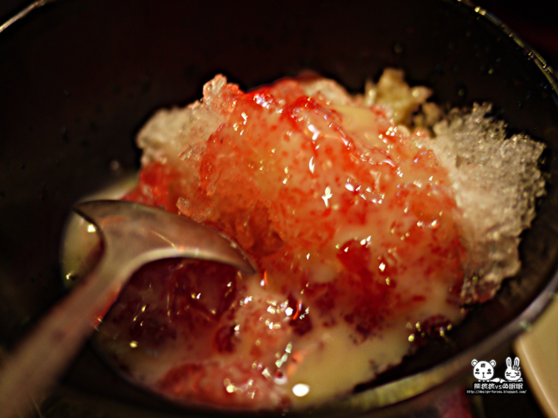 這是飯後的點心之一,冰的部份有點硬,不太愛,但加上草莓煉乳….其實蠻好吃的:P。
