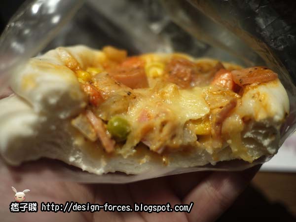 哇!這就是傳說中的披薩包,一開始還以為是把披薩包在裡面,沒想到是把包子做成披薩樣,內餡有玉米、火腿、熱狗、豆子等~