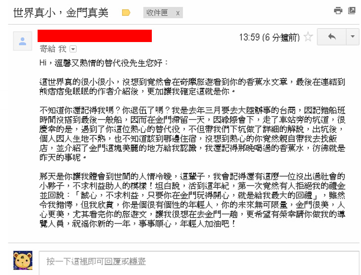以下這封是來自於去年三月結緣遊客的信,於2012年1月14號下午收到,並拍照於熊痞痞兔眠眠粉絲團與大家分享的內容,我只想說,我原本沒打算於部落格PO這張圖,但你惹惱我了,。,想要讓金門好,不是在那打嘴泡,請拿出行動!OK?