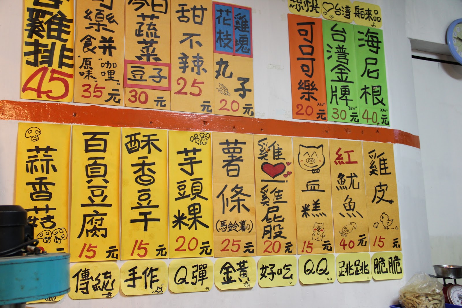 這家店最特別的,不是他們的炸雞,而是牆壁上這一排排的菜單,真是超級逗趣的阿,讓人看到會心一笑,那個QQ的豬豬血糕是怎回事阿?好可愛的小豬豬!跳跳紅魷魚?難不成吃到一半會從嘴巴跳出來嗎。。。。(謎:雞屁股應該畫一個屁屁的圖案吧XD)