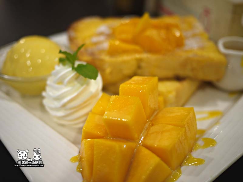 熊點的是芒果布丁吐司!兔呆說:「布丁吐司的感覺有點像是法國吐司,表面沾了蛋汁下去煎,上面灑上糖粉與芒果醬,最後在加上切丁的芒果就完成囉,其實在家裡也可以自己DIY的。」