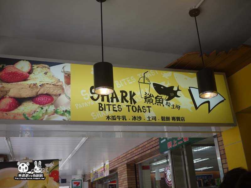 禮拜六兔眠眠一下課,熊就騎車機車載兔呆一起去吃,這家店的名字很特別,叫做鯊魚咬吐司,位置蠻好認的,就在7-11與麥當當附近,不過熊是路癡….一開始沒注意到這家店的正確位置在哪,是剛好有一位小姐在停車,差點把別人的車子弄倒,熊只好先停下來去幫忙,沒想到誤打正撞….竟然停在店門口附近,算是好心有好報麻XD。