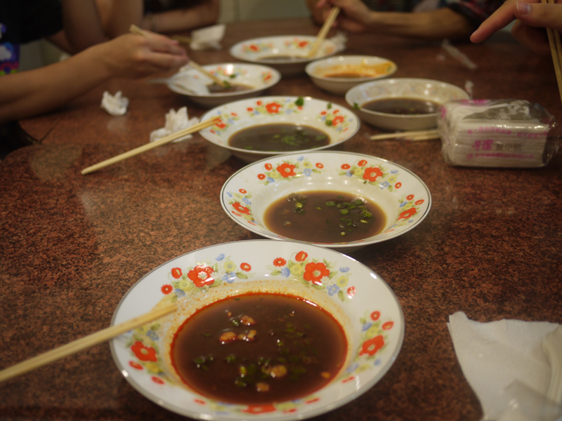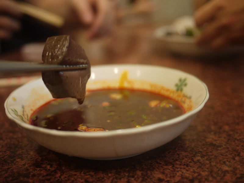 瞧瞧!滑嫩嫩的鴨血沾了辣醬,辣醬快滴下來的模樣真的是太可口了!