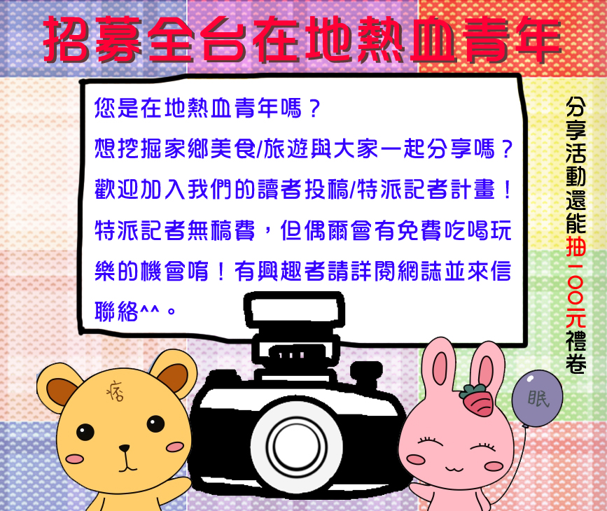 部落格創格一年以來,剛好有一些小成就與資源,於是希望能透過拋磚引玉的方式,讓台灣更多的在地青年,能為自己的家鄉發聲!讓更多的人能了解家鄉最美的一面,這也是我想招募特派記者的用意,有興趣的朋友,歡迎來信先跟我聊聊 [email protected] ,我叫熊痞痞,期待您的加入!