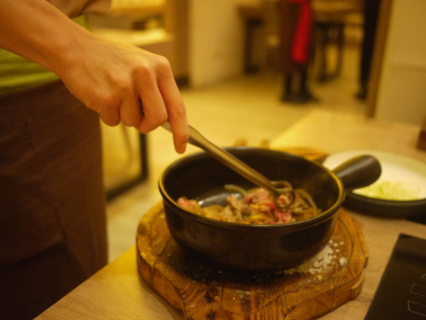 沒想到服務人員現場料理了起來,他是有點辣辣的,料理時還會被嗆到要小心=__=,最好笑的是,那時候熊VS兔被嗆到時,大概是嗆到的動作太好笑了,還跟服務人員在聊天,結果服務人員一不注意也被嗆到,哈哈,我們真是來搞破壞的耶XD。