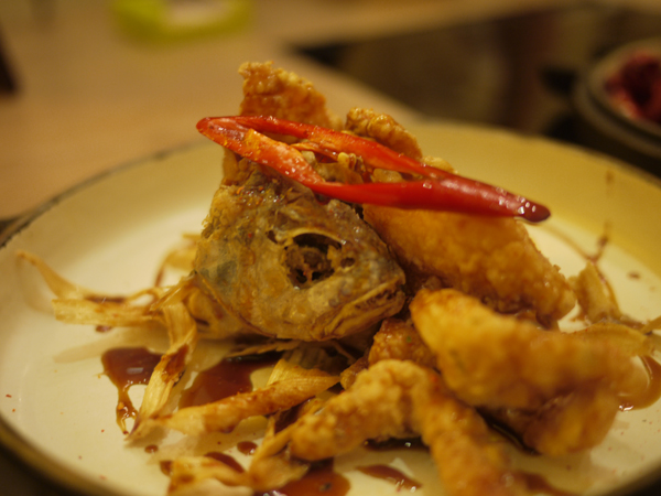 這是店家額外招待的烏鎮香酥魚,不在點菜範圍內,烏鎮香酥魚的是用黃魚,煙燻味很重,吃起來很夠味,醬汁偏甜,這算是今天的第三道炸食….所以吃到這時,兔是覺得膩膩的,但對重口味的熊來說還OK啦。