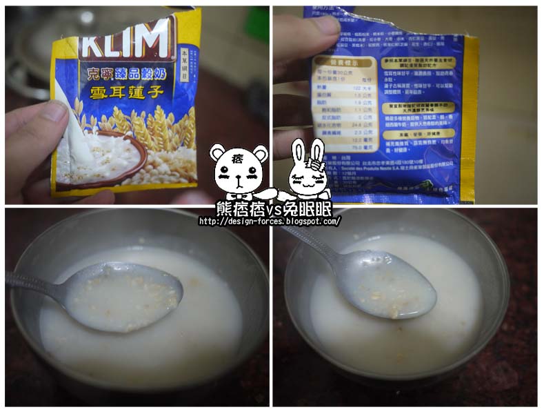 這次試喝的共有燕麥薏仁雪耳蓮子桂圓紫米紅棗黑珍殼四種口味,因為是第一次喝到這種產品,熊痞痞以為…就跟泡牛奶一樣,於是拿著杯子直接泡來喝…沒想到泡完燕麥薏仁後….真是殘念阿=口=!…表面看起來只有一點點的薏仁,熊痞痞不以為意的直接喝…結果喝到一半後…才發現底下至少有1/3都是燕麥薏仁…有點誇張!雖然後來跑去樓下拿湯匙來挖…但湯匙過大挖不到,只能沖水洗掉了Q~Q。