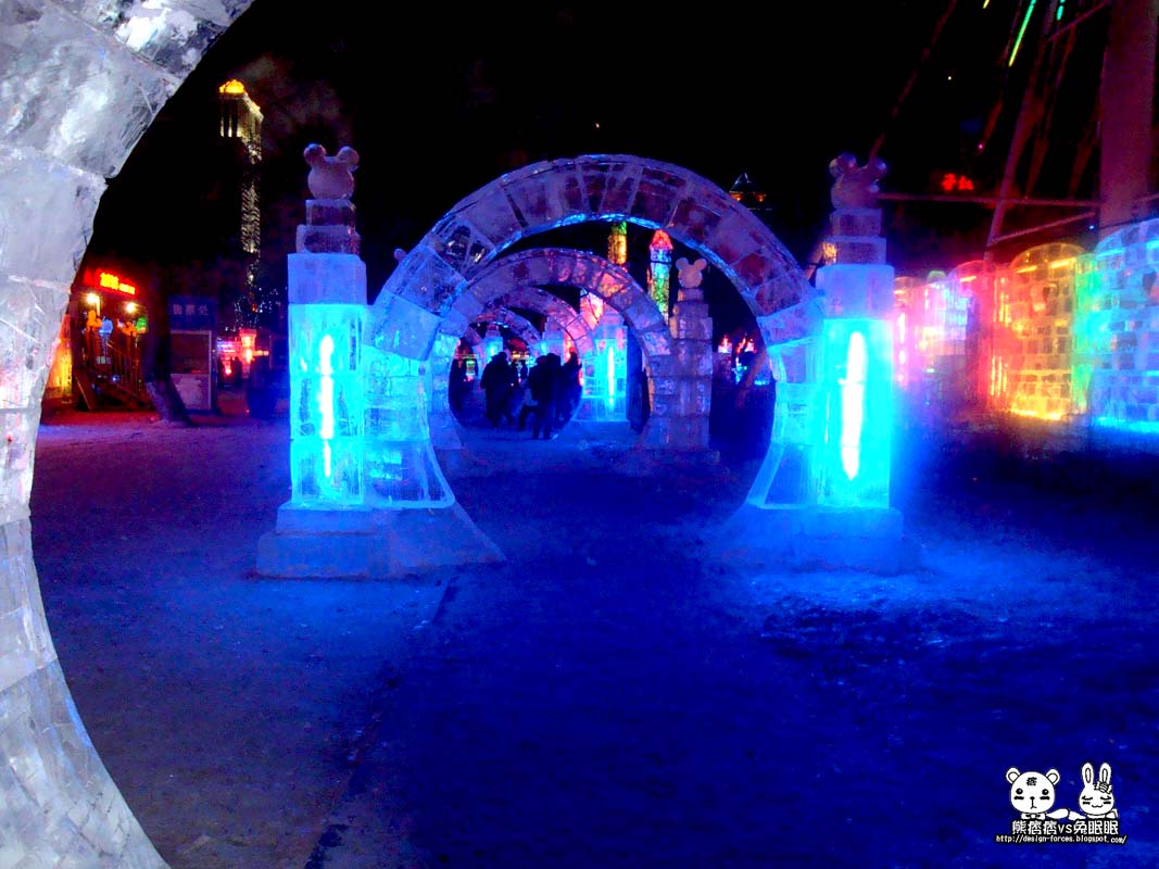 往前一走,是迪士尼造型的時光隧道!當我們仔細一看,還可以在冰雕牆上,發現迪士尼卡通造形的人物,這些圓形造型的門,全部都是用冰雕做成的….超強!