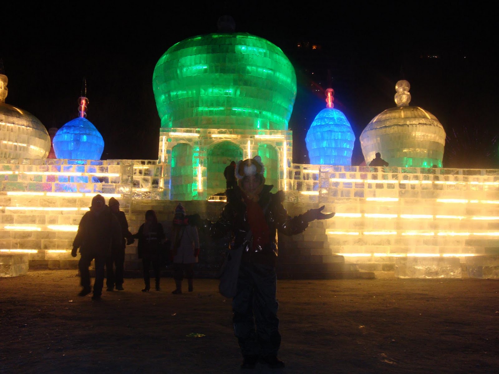 這是我們的領隊教授,一進入會場,連教授也愛上了這五彩炫光的冰雕城堡呢,這個城堡可不是一般的冰雕堡,由於樓層很高,裡面有電梯可以搭乘,城堡左右兩邊,都有兩座極高的溜滑梯,是許多大朋友小朋友的愛,想要溜滑梯還要排隊呢。