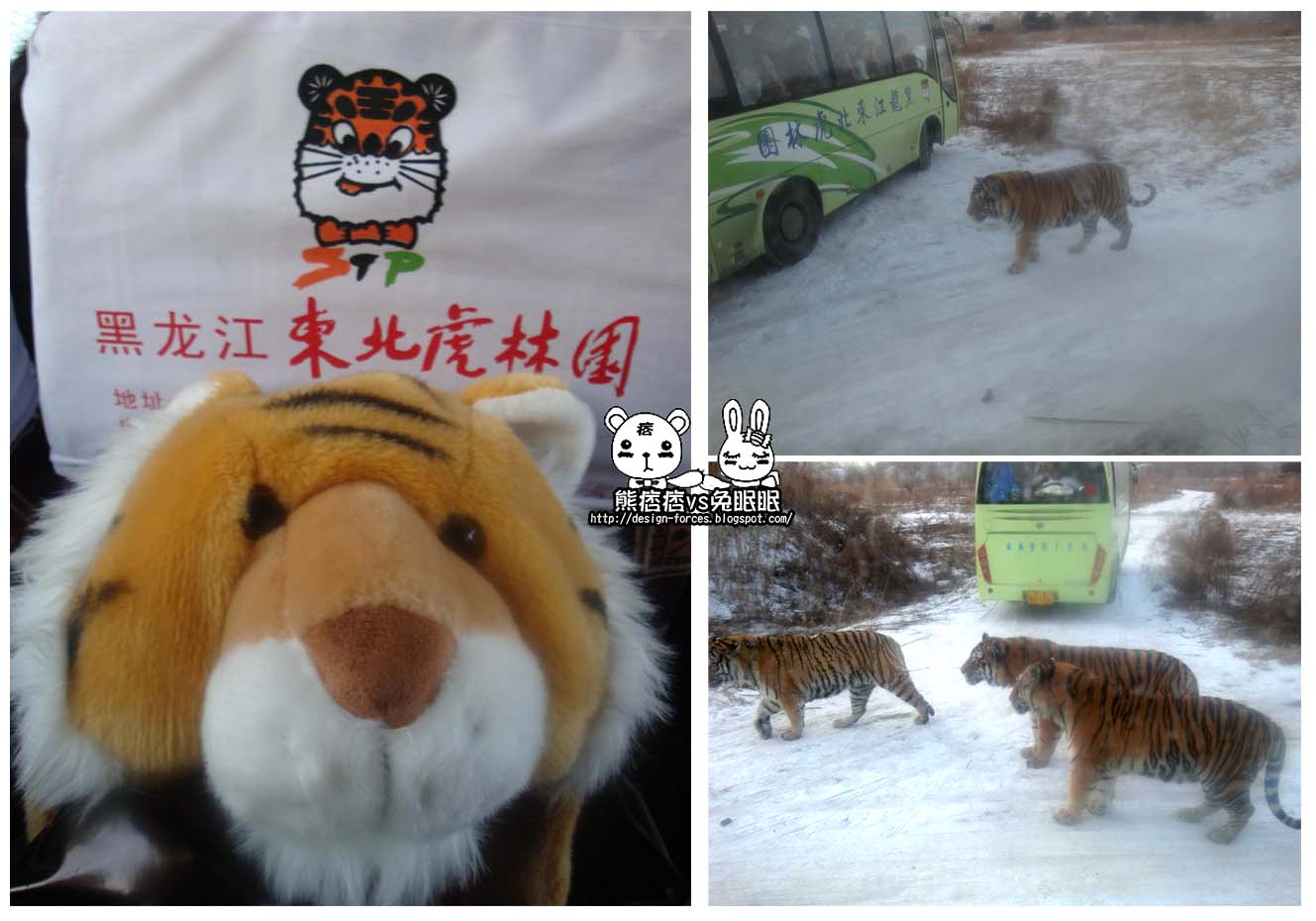 到了東北虎林園區,我們搭上另一台園區內的專車,熊痞痞那時一直覺得,它的老虎畫的好好笑,不過車內的裝置的真的很應景,一系列的老虎圖,讓熊痞痞不自覺得把老虎帽拿出來合照,車外則是隨處看得到慵懶的老虎走來走去,誇張的是….有時候老虎還會去撞車!或者跳到車上(驚)!!!車頂上啦~