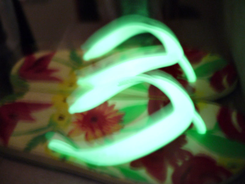 而這雙白色耳帶的人字拖,則傳說中的夜光精靈,此耳帶在吸收足夠的光源後,就會在夜間產生特別的螢光效果。