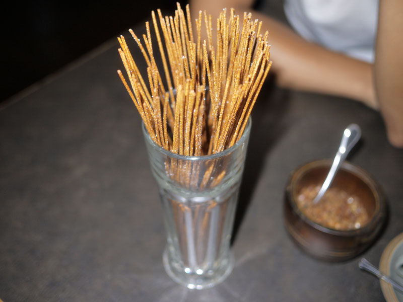 來唷來唷!燒香拜拜喔!疑?怎麼有點怪怪的,乍看之下,還以為上來的小吃是拜拜的香耶?好險今天不是七月來這邊,不然嚇都嚇死了…(誤)!原來這一根根像拜拜香的美食,竟然是號稱地下夜店-藝耕家的吉他弦