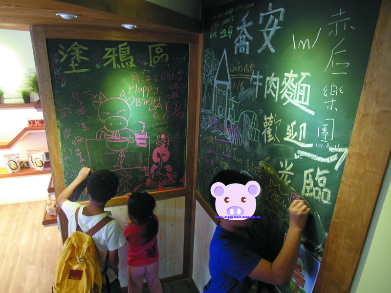 走到最裡面是往二樓的樓梯,二樓為熱食用餐區, 在樓梯口放著兩個大黑板,是供旅客參觀拍照簽名留念用的, 我個人覺得上面的圖畫讓我有幾分貼切的感覺(頗有教室的feel~) p.s那個被豬齁齁貼上豬頭標誌的是我媽媽朋友的小孩,超皮的,拿起粉筆就亂破壞=口=