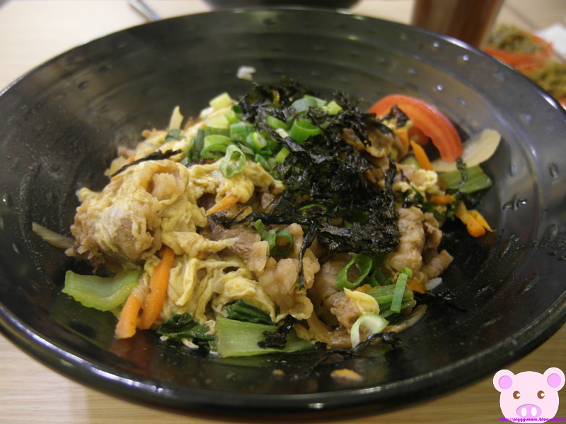 這是豬齁齁點的牛肉蓋飯,份量看起來小小的,卻是能讓人剛好飽足的份量,上面的紫菜酥(似乎是某家貢糖廠的副產品?!)在此有畫龍點睛的效果,豬齁齁不敢吃紅蘿蔔,可是這蓋飯裡的所有食材調味都讓人一口接一口,最後豬齁齁竟然連紅蘿蔔一起吃下去了,微辣,飯蓋在食材下方,偏濕很好入口,蛋似乎有經過特殊調味,有股特別的香料味,這是豬齁齁每去必吃的,一份$90,是適合三五好友聚餐聊天點的餐^^