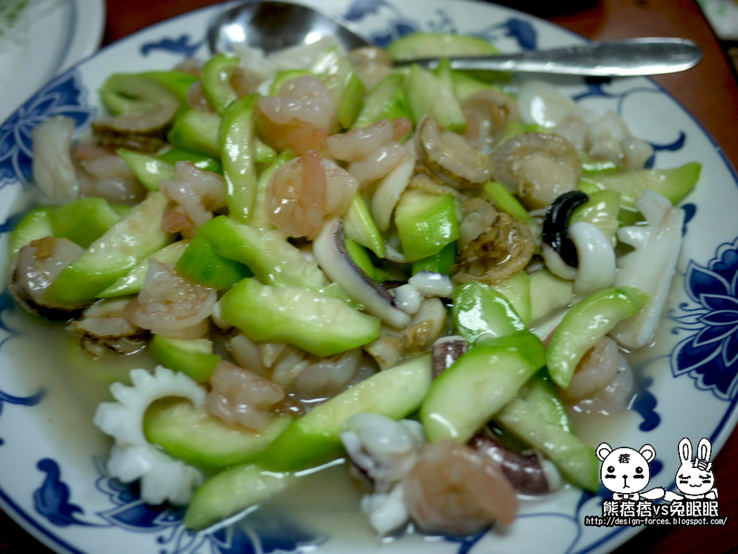 在許多網友強力推薦之下,熊痞痞終於跑去復國墩新天地海產店吃飯囉!這家店的外觀,熊痞痞忘記拍了,店家外面有專門的停車場,停起車來蠻方便的,去的時候是晚上,人很多,這家店最大的特色,大概就是海鮮了!幾乎每道菜都脫離不了海產呢,像上面這一道菜好像是烤小捲,咬起來很Q有彈性,味道也很夠味,一上來就被秒殺了!