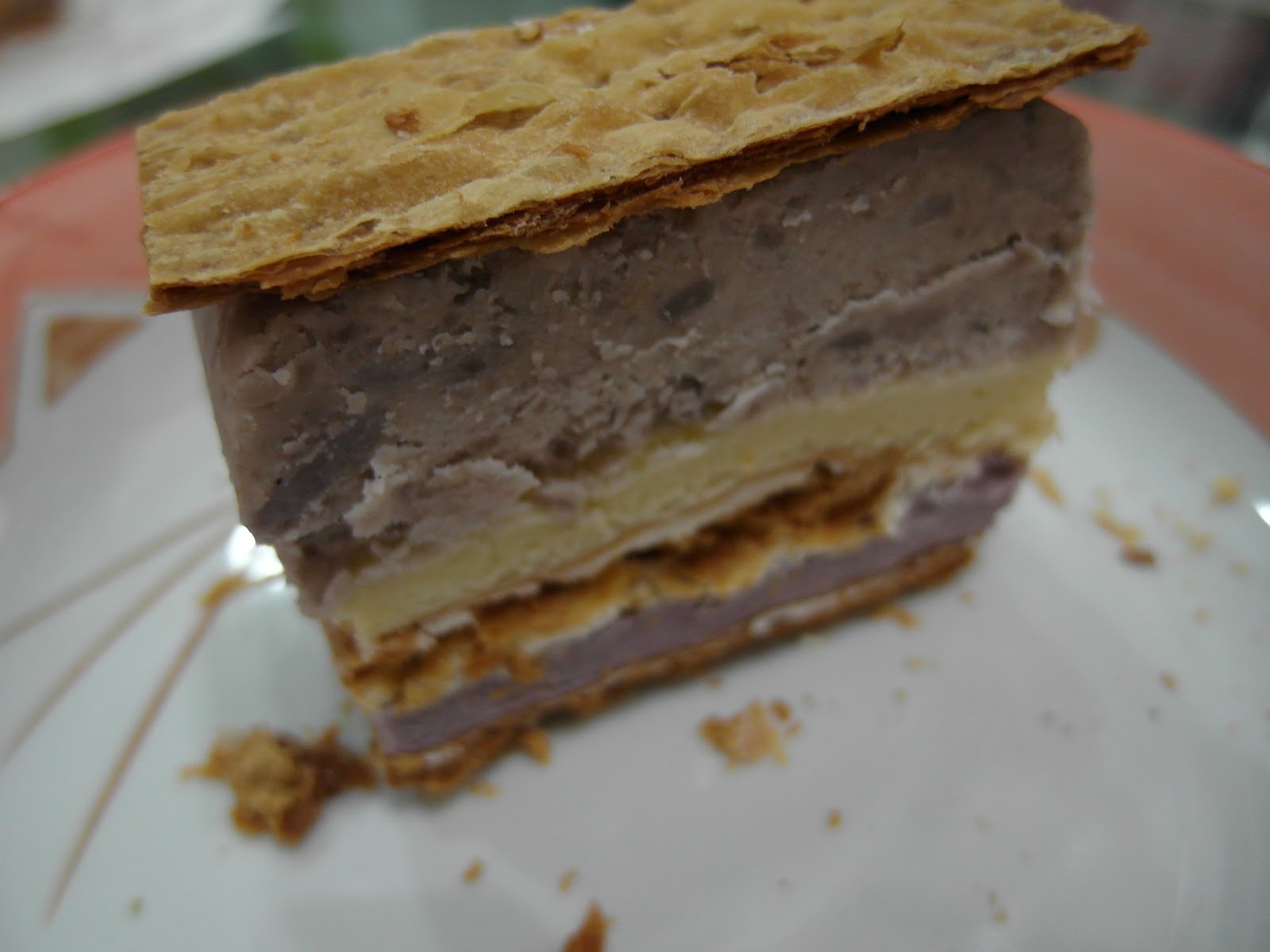 大致來說拿破崙芋頭蛋糕很不錯吃,從外層的上下派皮、芋泥餡、海綿蛋糕、海綿蛋糕中又夾著一層派皮,搭配著吃可以吃到不同的口感,但由於內餡很扎實,芋泥餡小湘覺得邊配茶邊吃比較不膩口,而且拿破崙把派皮分開後,覺得派皮好脆好好吃喔!小湘應該可以把全部派皮都吃光光吧XD