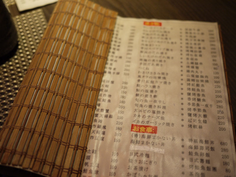 這是隱藏居酒屋的菜單,用竹簾串成冊,採用中文搭配日文的方式,多而整齊,每一道菜的單價大概在200元左右。
