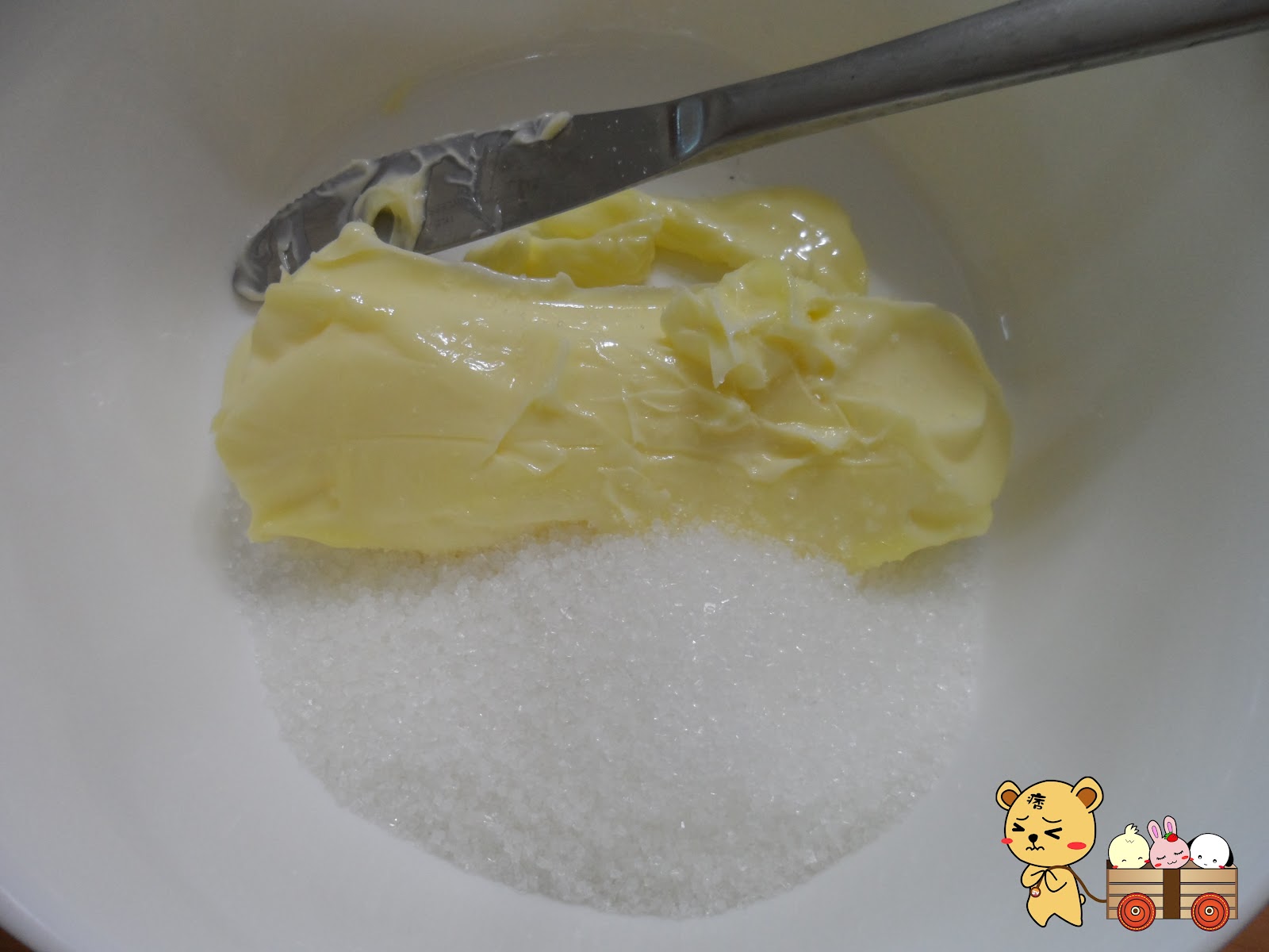 首先將奶油和白砂糖放入盆中攪拌均勻。