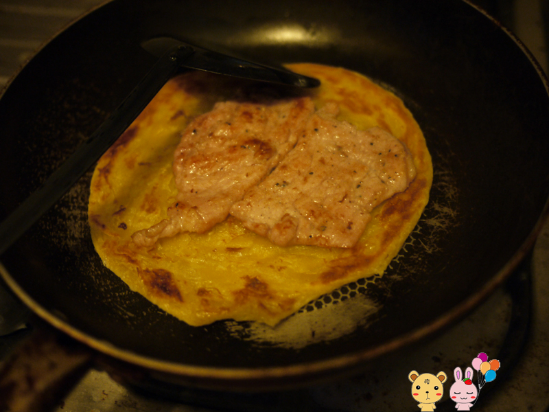 後來再把多餘的豬排跟南瓜餅混在一起,變成南瓜蛋餅!做法很簡單,一開始先把蛋餅煎到7分熟後,再把豬排放進來。