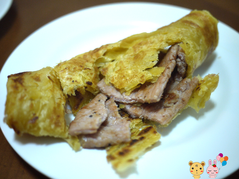 但是後發現….自己太貪心放兩塊豬排,導致豬排蛋餅過厚,沒辦法正常切,就變成上圖這麼奇妙的美食了,恩為了順應中秋節,就稱他為月亮豬豬蛋餅吧^^。