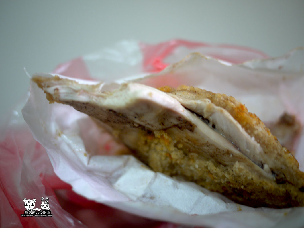 這張的雞排是去年十二月買另外一家雞排拍的,一般所謂的大雞排都是像這樣被壓扁過的,肉肉的部份,很薄又乾,要價50元,雖然香料弄得不錯吃,但薄到讓我不想介紹,所以就沒去撰文,這次剛好遇到這大臉雞排拿來比對一下XD。