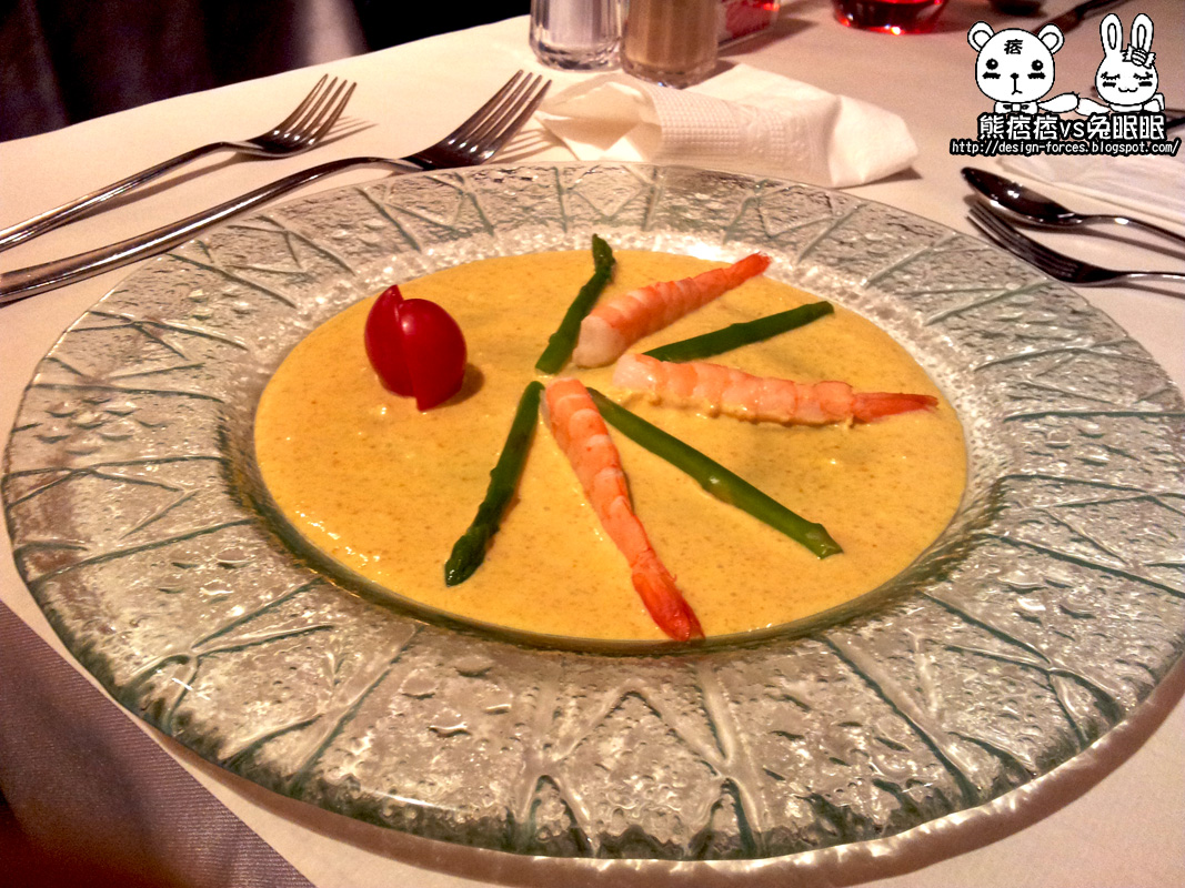 第一道開胃菜是鮮蝦蘆筍,這道菜很好吃,尤其是旁邊的醬,有濃濃的咖哩味。