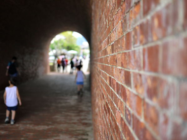 接著導遊開始介紹一些關於億載金城的歷史淵源,入口處的城門,是採用法蘭斯磚砌法而城的,蠻像金門古厝的感覺,早期的橋是懸掛式的木板橋,若有敵軍進攻,則會將木板橋收起,當然,現在我們所踩的是整修後固定的橋,並不是當初的那種,千萬別傻傻的去那邊跟導遊說,木板橋在哪阿?XD。