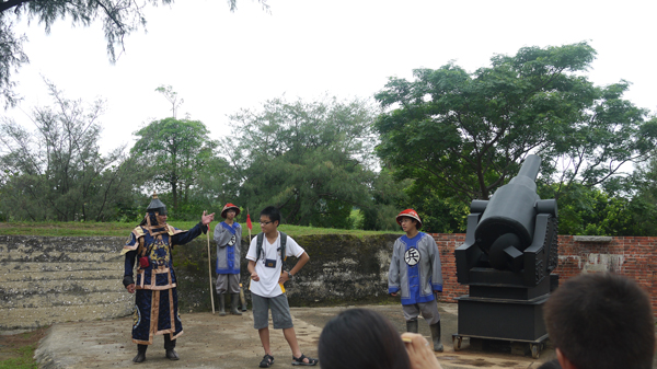過城門洞沒多久,導遊就催促我們要趕緊前進,走到現場後才知道,原來現在這個時段剛好有表演阿!這些清兵打扮的人員,會隨機請遊客來打砲(好害羞的感覺阿-////-)。