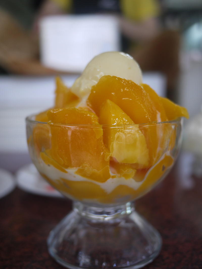 在吃這道冰時,其實熊覺得自己不是來吃冰的,反而是來吃芒果的,芒果似乎是不用錢的樣子,多到誇張!上層有一球冰淇淋,底層則有一些薄弱的牛乳冰,大多數都是在吃芒果的。