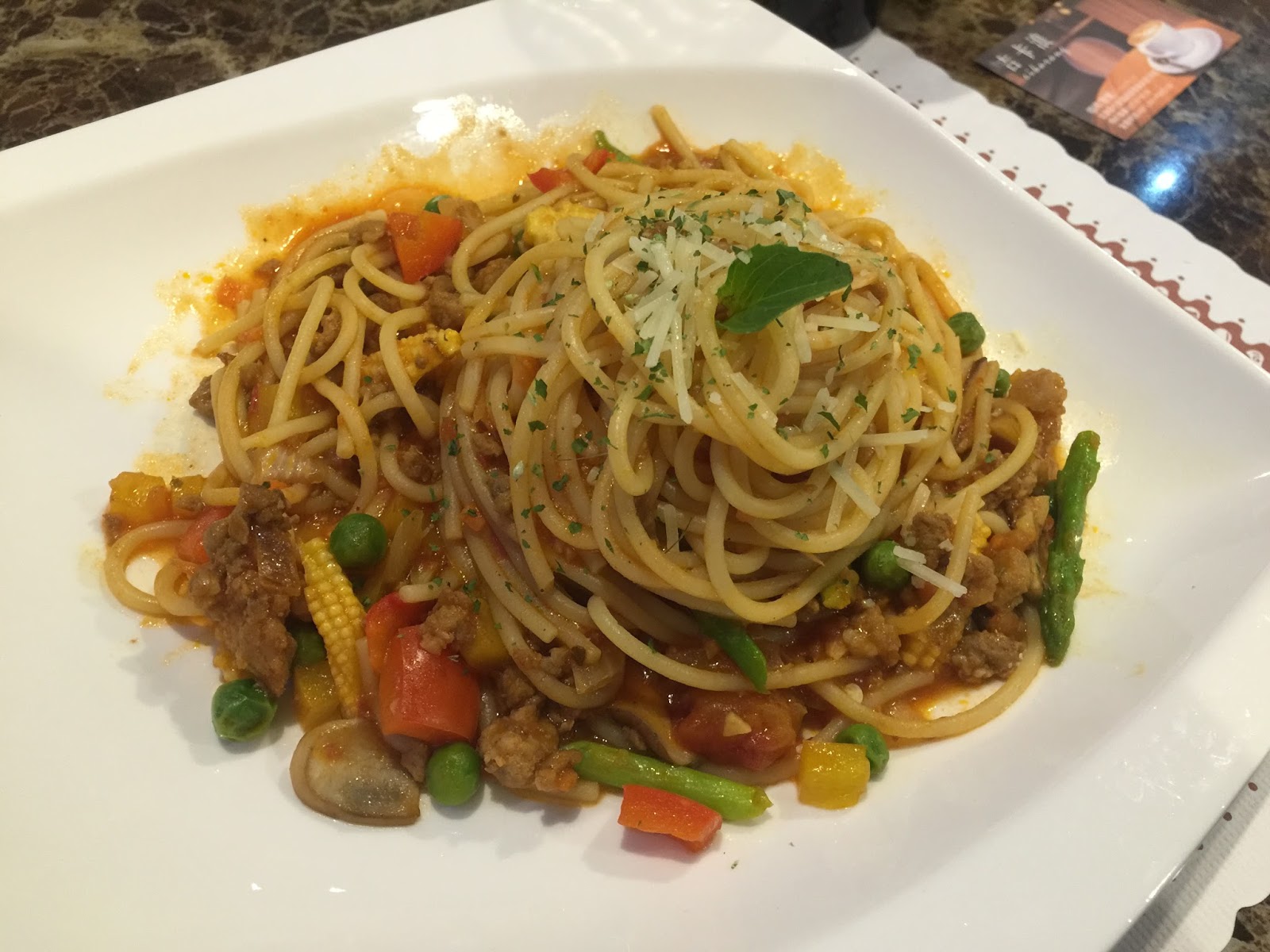 肉醬義大利麵,整個就是料多實在,不是純粹肉醬拌麵,看得見蔬菜及肉末,麵條口感適中不會軟爛且挺入味的。