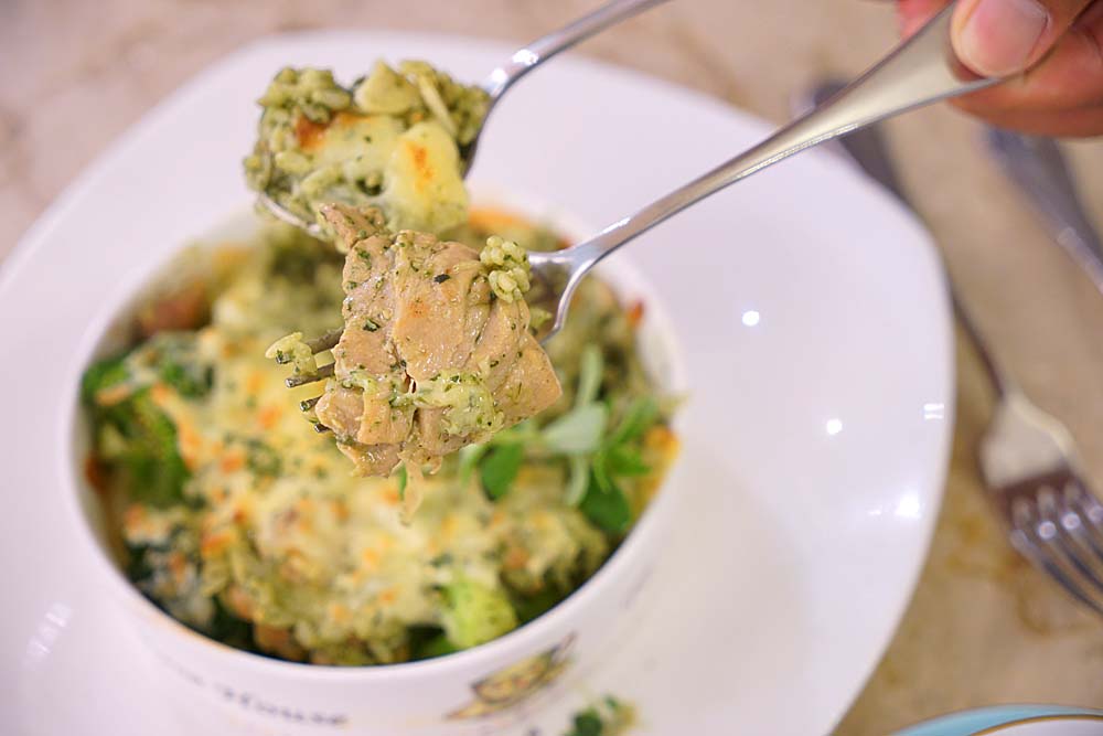 青醬嫩雞焗烤飯我推薦可以點來吃吃看,羅勒的香味伴隨著牽絲的起士十分討喜,分量足夠,女生吃這個就會很飽了。