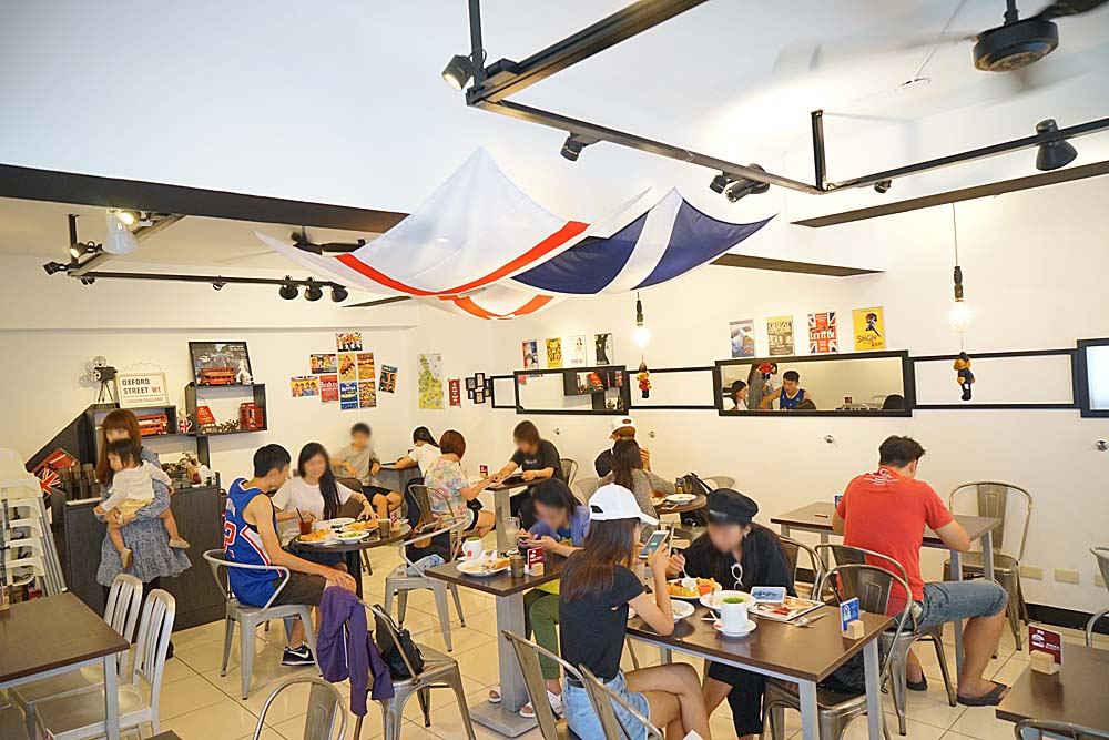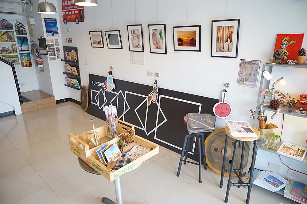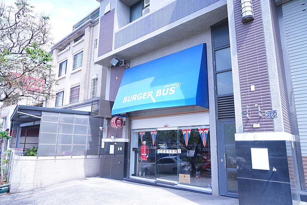 台中漢堡巴士整體元素偏英倫風格,遠遠一看就被藍色招牌給吸引住,雖然地面有些凹進去,會被旁邊的住宅給檔到,但招牌很明顯所以也不容易錯過。