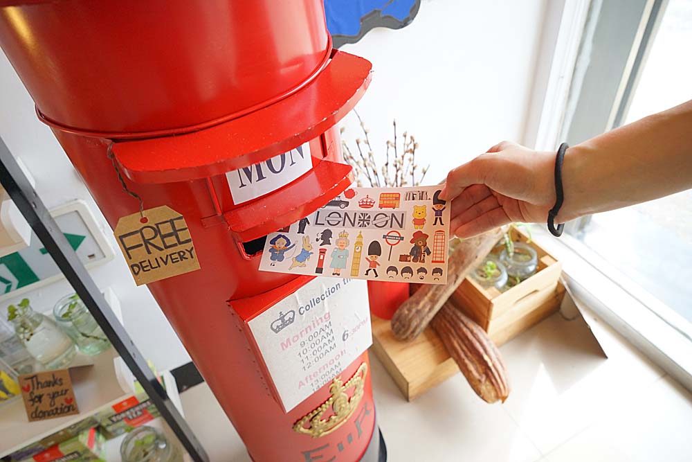 這是英國的郵筒造型,還可以寄送明信片唷!應該是店家事後會幫忙的。