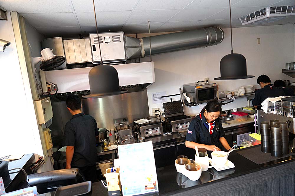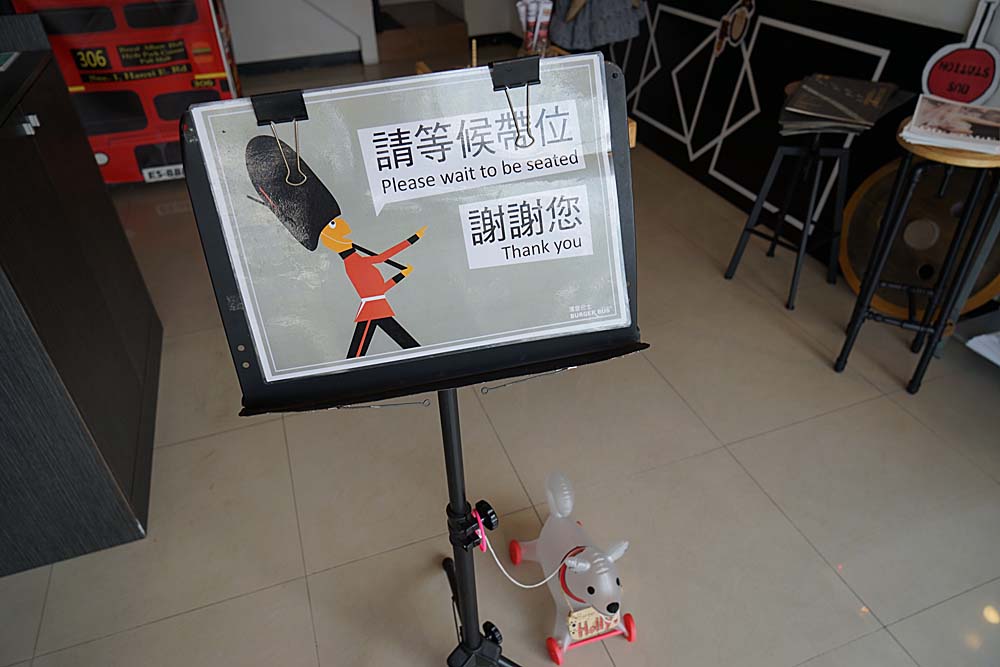 師傅料理好餐點後,會先把東西放在一旁的偽英國巴士上,在由服務人員端上去。