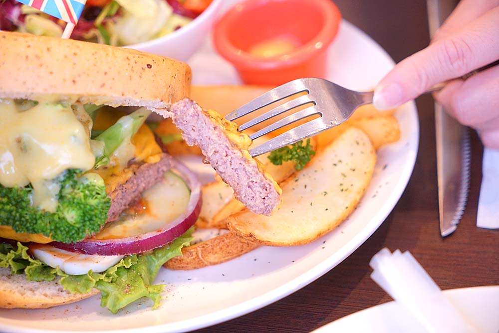 這份是蘇格蘭綠寶石,一開始上桌時,我有點傻眼!以為這該不會是素食吧!也太綠意盎然了吧!一整朵的花椰菜,襯托著底下的四盎司牛肉,第一口咬下時,可能剛好咬到最硬的地方,有點不好入口,可是接著咬下時,卻又發現花椰菜的組合竟然可以跟牛肉如此搭,以前總覺得牛肉堡吃多了會膩,但這份卻是很清爽的牛肉堡唷。