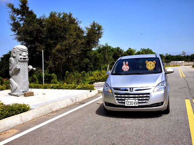 瞧瞧他的披風隨風起舞,殺不殺!這樣好像太短了,那就順便說說風獅爺身後的那台休閒車,是我們這次旅行金門三天兩夜的交通工具喔。