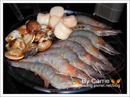 這盤是海鮮,有蝦、蛤仔和干貝,其實食材都滿新鮮的!