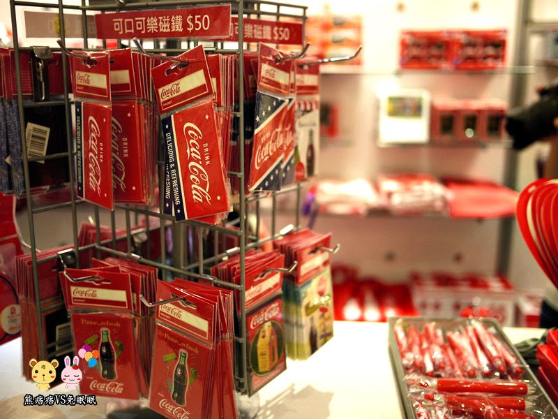 清一色望過去,毎一個商品上一定會印有Coca-Cola的品牌,看著看著,也讓熊心目中覺得可口可樂真的很強大,一個飲料竟然可以在全球兩百多個以上的國家銷售,並發展出屬於自己多種獨特的週邊商品,真不知道哪時候熊VS兔才有機會可以跟這些大前輩看齊呢!